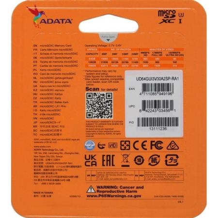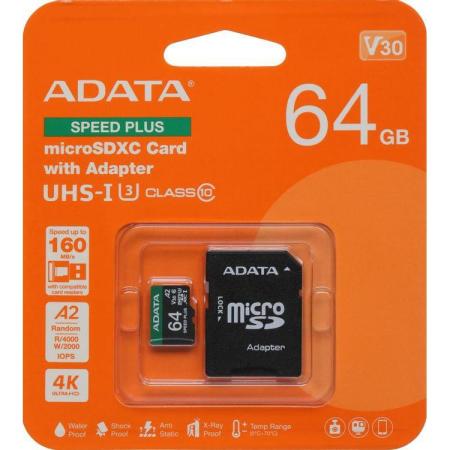 Карта памяти microSDXC UHS-I U3 A-Data Speed Plus 64 ГБ, 160 МБ/с, Class 10, UD64GUI3V30A2SP-RA1, 1 шт., переходник SD